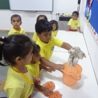 The children were shown the variety of vegetables which are available in the market through a class demonstration. The health benefits were explained to them. In the end, they were told to segregate veggies according to their shapes and sizes. With this activity, we hope that our little ones will feel motivated to increase the consumption of greens in their daily diet.